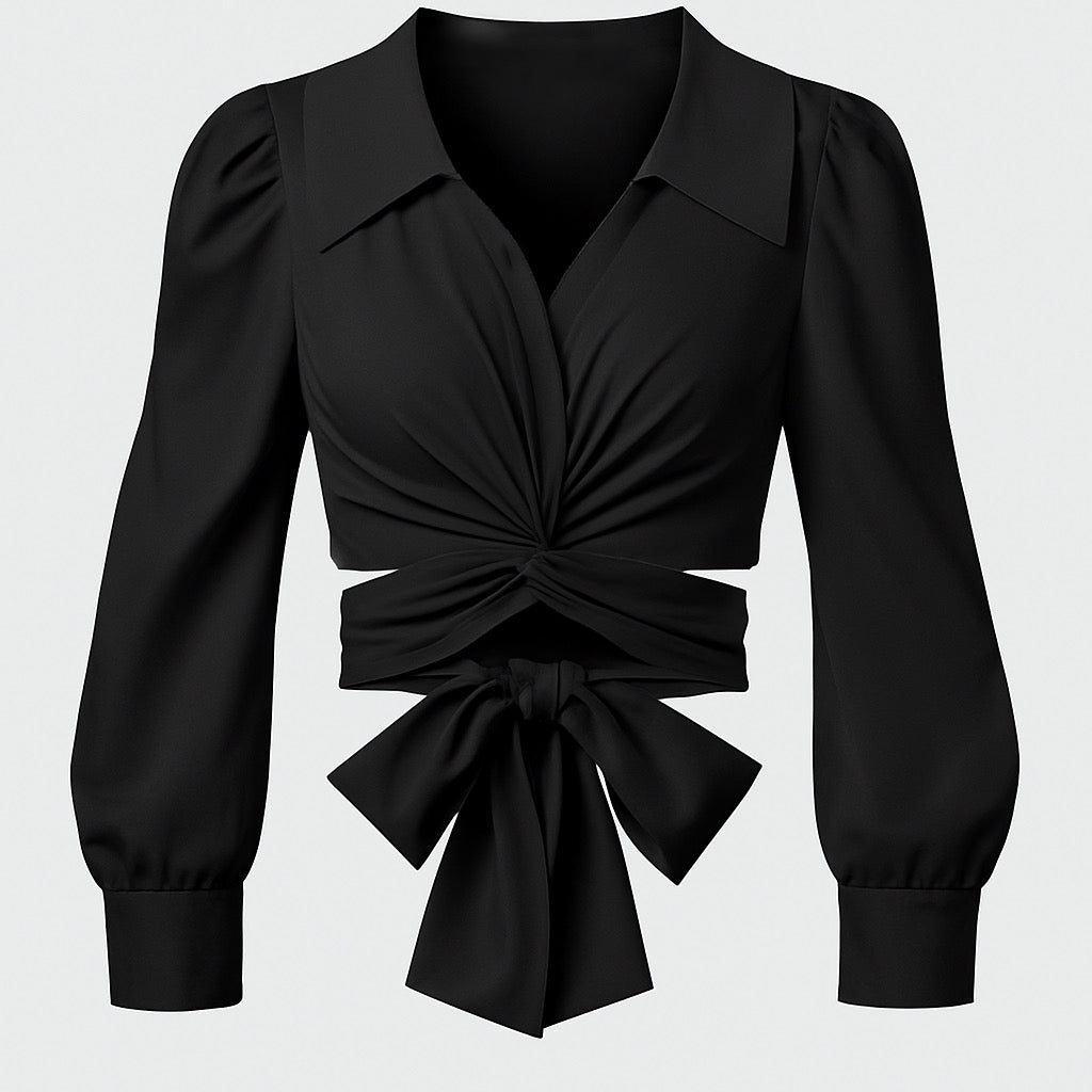 This solid black cotton wrap blouse features a flattering tie waist and crisp, breathable fabric—perfect for effortless,...
