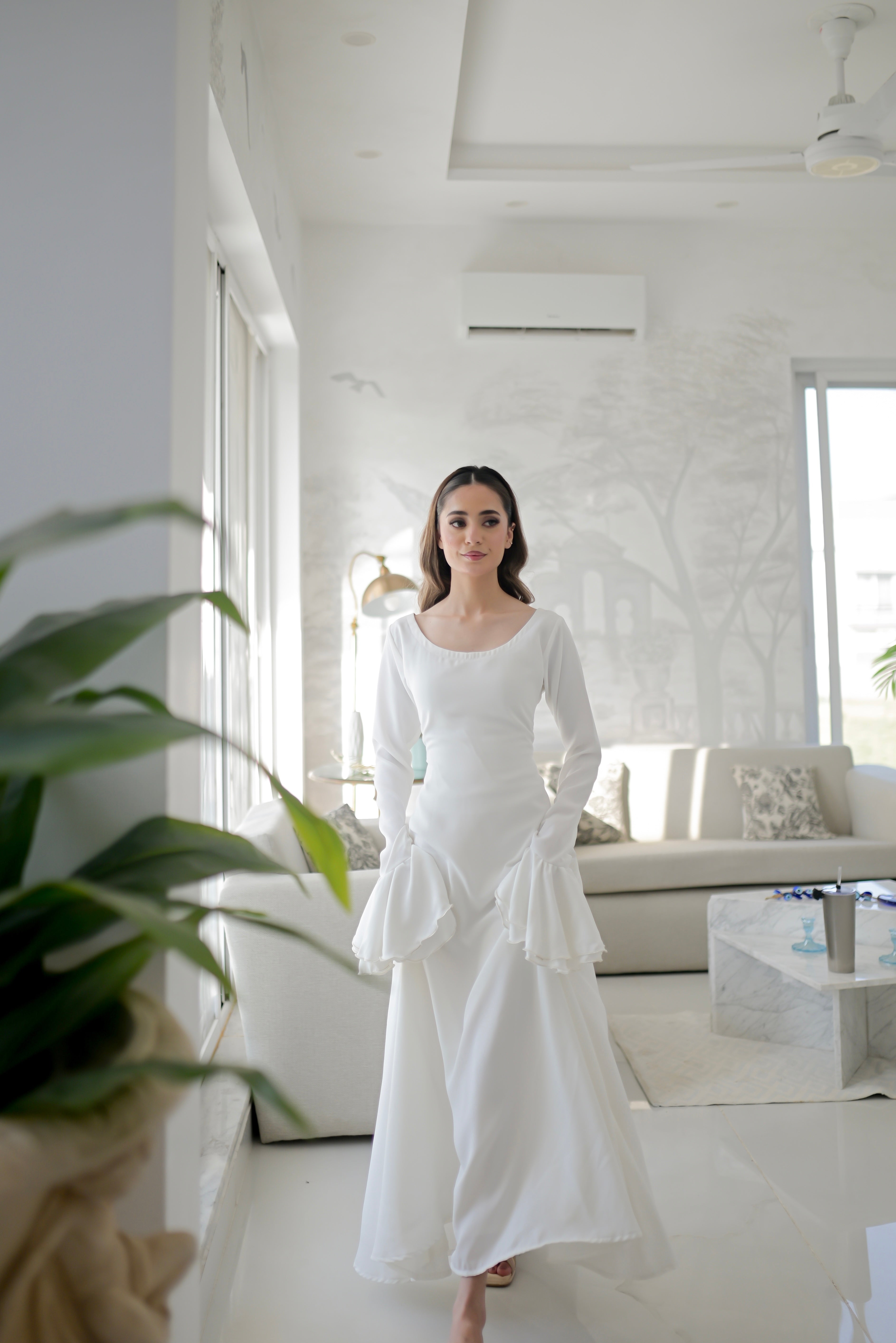 The perfect blend of elegance and ease, designed for sunny days and dreamy getaways. Featuring a classic round neckline and long, flowy sleeves with delicate frills, it brings a soft, romantic touch to your summer wardrobe. The adjustable corset-style belt at the back cinches the waist for a flattering, feminine silhouette, making it ideal for everything from beachside lunches to golden hour strolls.