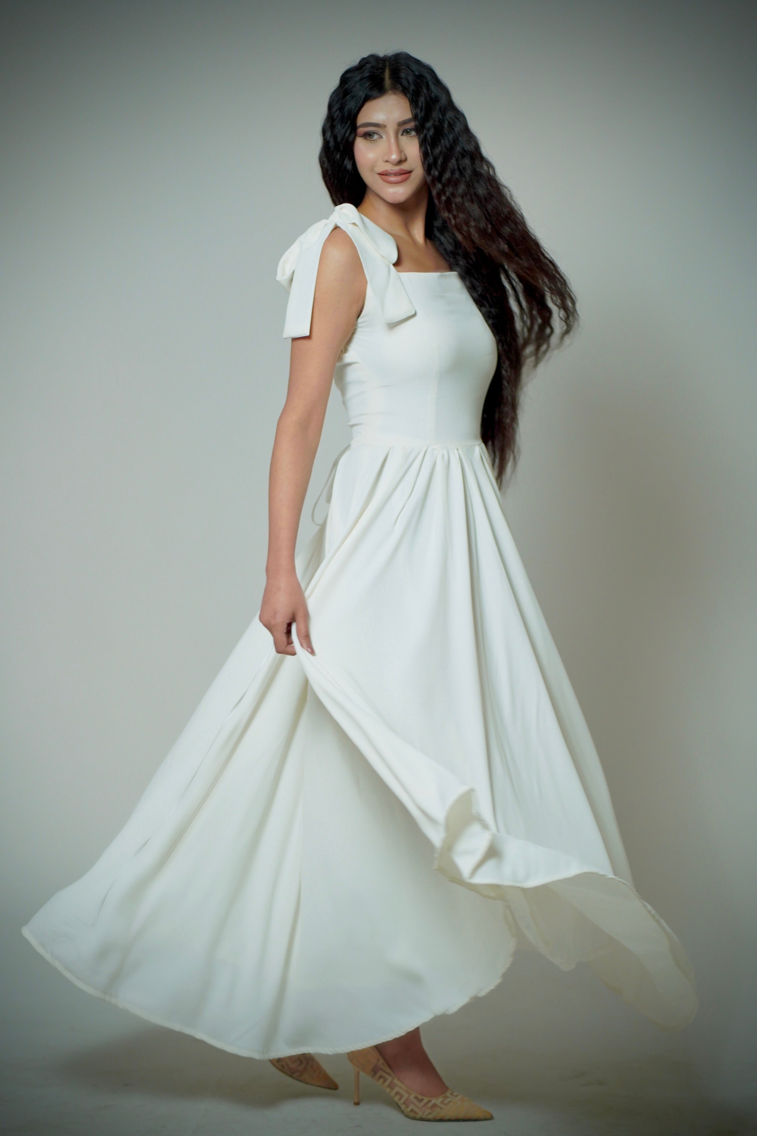 This white dress features playful bow-tie sleeves and a light, breezy design. Perfect for sunny days and...