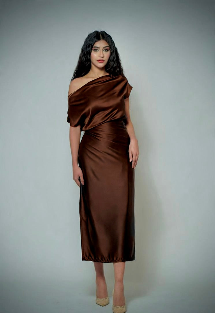A luxurious chocolate brown silk two-piece set featuring a sleek pencil wrap skirt and a romantic drop-shoulder blouse. The figure-hugging skirt creates a sophisticated silhouette, while the blouse drapes softly off the shoulders for an elegant, timeless look.
