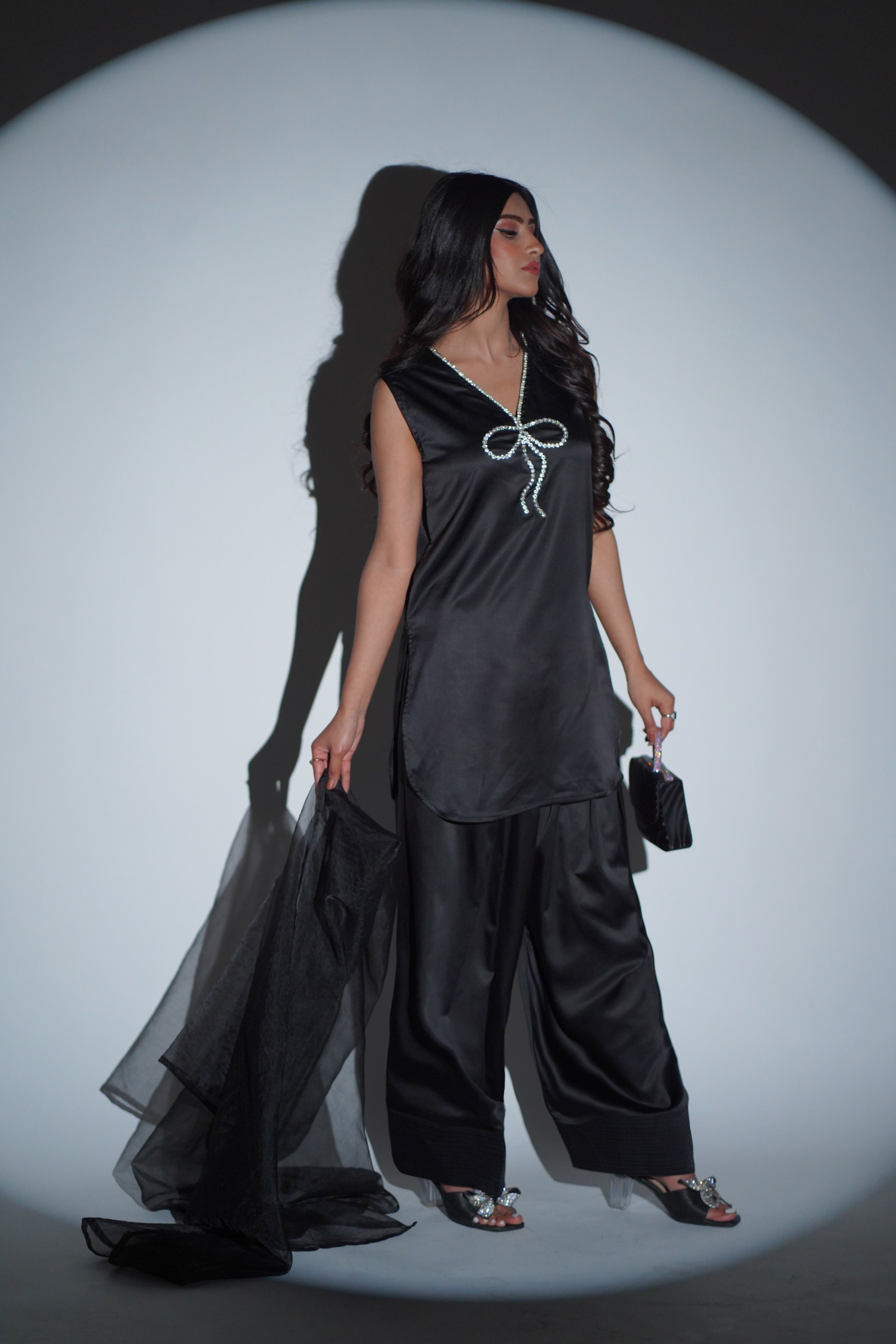 An exquisite soft Silk, adorned with crystals embroidery short kurta paired with a farshi shalwar and plain...
