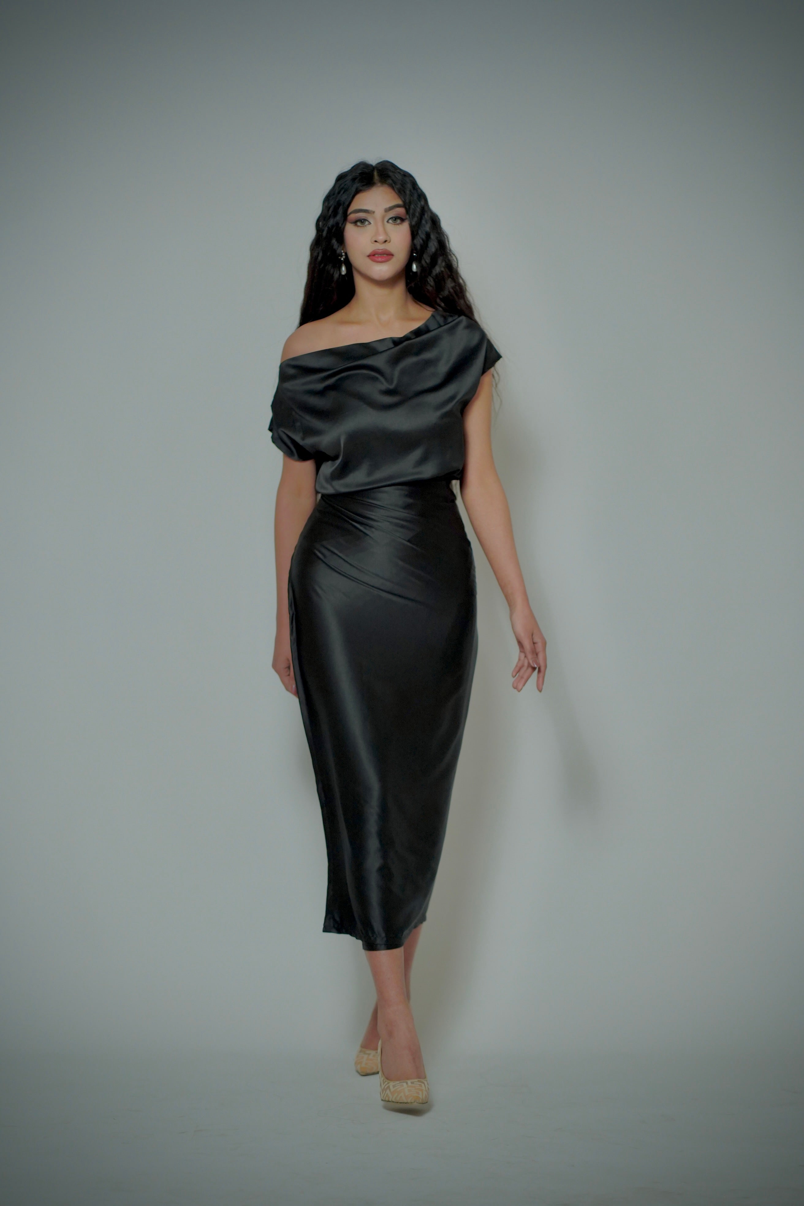 A luxurious black silk two-piece set featuring a sleek pencil wrap skirt and a romantic drop-shoulder...