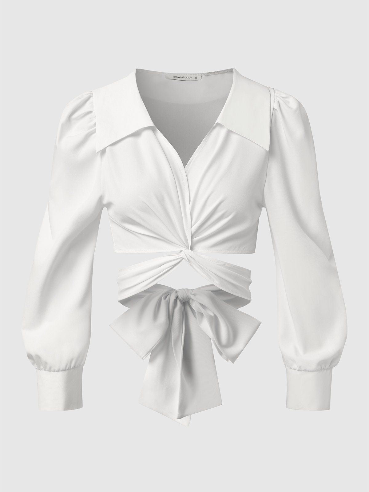 This solid white cotton wrap blouse features a flattering tie waist and crisp, breathable fabric—perfect for effortless, everyday style.