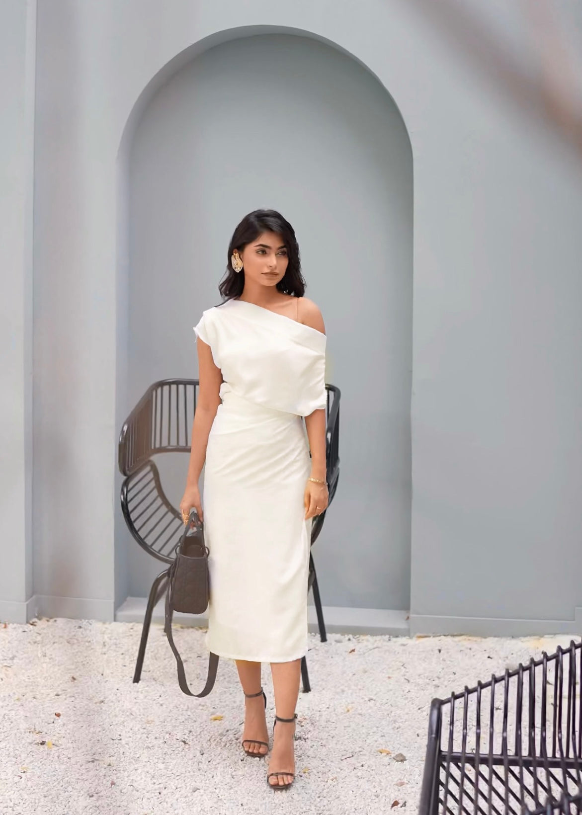 A luxurious and elegant white two-piece set featuring a sleek pencil wrap skirt and a romantic drop-shoulder blouse. The figure-hugging skirt creates a sophisticated silhouette, while the blouse drapes softly off the shoulders for an elegant, timeless look.